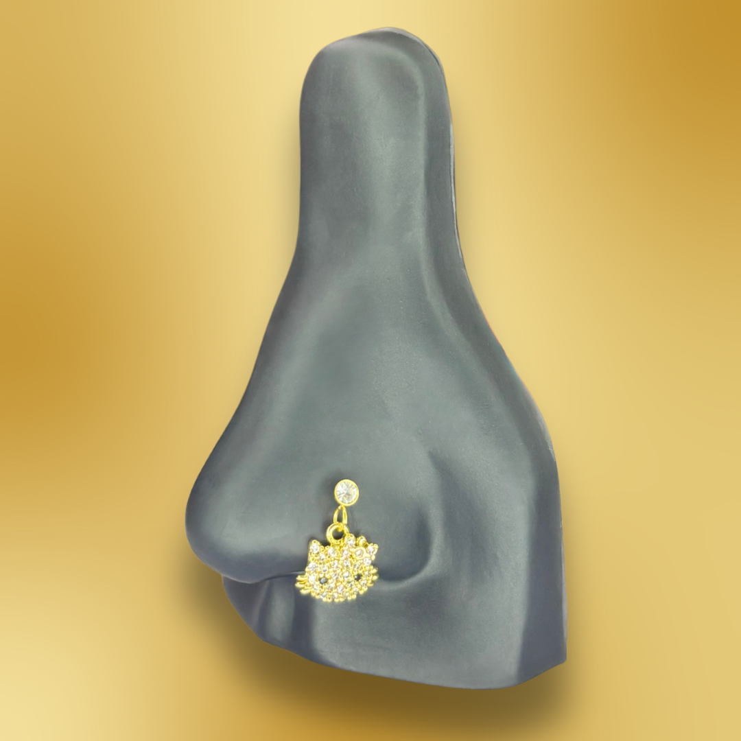 This nose charm is giving kawaii baddie in the cutest way. The crystal-lined kitty face with a soft dangle brings that playful Sanrio-style energy while still serving sparkle and grown-girl glam. It’s the perfect mix of adorable and bougie — the kind of piece that makes your piercing look instantly sweeter and still very “her.”